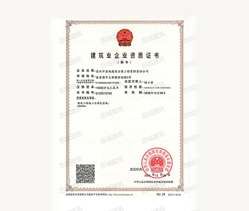 蘇州市蘇城建筑安裝工程有限責(zé)任公司,擁有主項(xiàng)建筑工程施工總承包一級資質(zhì),增項(xiàng)市政公用工程施工總承包二級資質(zhì)和建筑裝修
